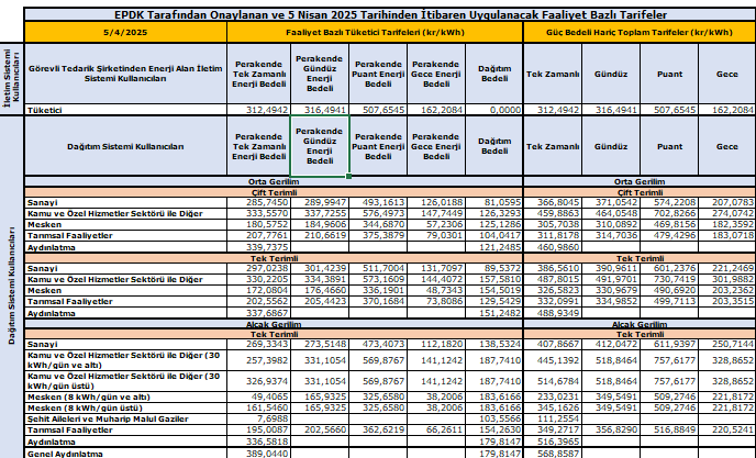 05/04/2025’ten İtibaren Geçerli Olacak Elektrik Tarifeleri