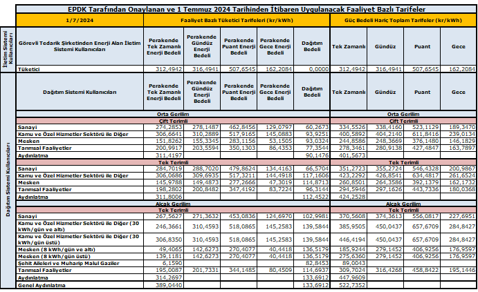 01/07/2024’ten İtibaren Geçerli Olacak Elektrik Tarifeleri